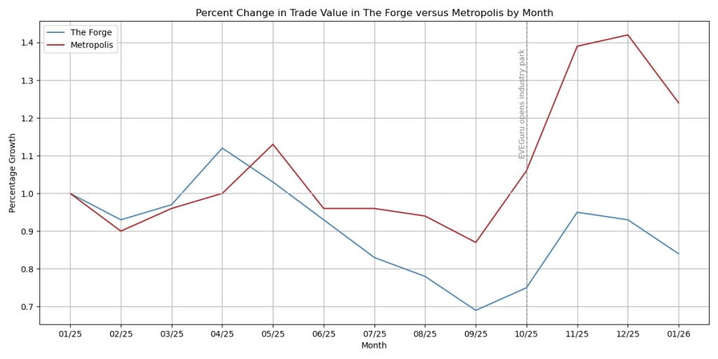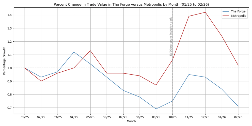 I’ll temper my earlier conclusions that we are seeing Metropolis’ growth from EVEGuru Foundries in Metropolis, because while that is likely helping, Metropolis grew rapidly the month before. So, whatever is elevating Metropolis at that growth rate, EVEGuru Foundries is clearly going to tap into the existing market growth should it continue. This is also to say that while EVEGuru has yet to release production rates using their manufacturing rigs, it is unclear if EVEGuru will affect markets to any degree. It is too early to tell.
